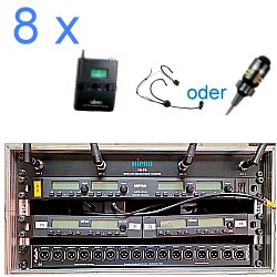 8 Mikroports bestehend aus 8 Taschensender ACT-32T plus 8 Lavaliermkrofon bzw. Headsets und zwei 4-fach Empfänger ACT-343